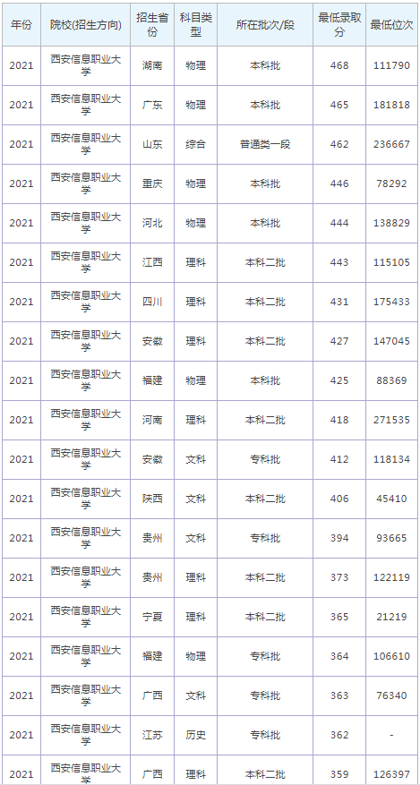 想要報考西安信息職業大學的同學,都比較關注西安信息職業大學今年的錄取分數線,那么,高考多少分可以上西安信息職業大學呢?西安信息職業大學歷年最低錄取分數線是多少? 下面為大家整理了西安信息職業大學錄取分數線,希望對大家有所幫助,僅供參考。![]() 2021西安信息職業大學錄取分數線 ![]() ![]() 西安信息職業大學是幾本? 西安信息職業大學在陜西和全國基本是本科二批招生,所以我們通常認為西安信息職業大學是二本大學。 ![]() 西安信息職業大學簡介 西安信息職業大學坐落于陜西省西安市,是國家教育部批準的全日制職業教育本科大學,是全國首批本科教育改革試點院校,具有獨立頒發國家承認統招本、專科學歷資格。 學校始于1992年創建的陜西電子科技職業學院,2005年學校遷新校址,2019年5月,更名為西安信息職業大學。 通過對西安信息職業大學錄取分數線的了解,大家大概知道了高考多少分可以上西安信息職業大學,以上數據源于網絡,僅供參考,大家如果想要了解其他大學錄取分數 線、大學簡介、大學排行榜、專業選擇等內容,請點擊訪問:大學欄目。 推薦閱讀: 新疆大學錄取分數線 西藏大學錄取分數線 喀什大學錄取分數線 石河子大學錄取分數線 蘭州大學錄取分數線 高考多少分可以上寧夏大學? 西北師范大學錄取分數線 |