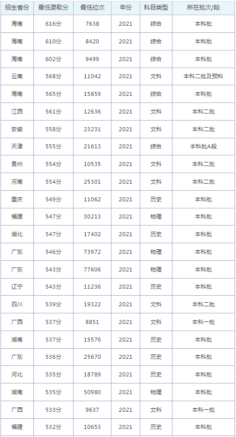 想要報考南寧師范大學的同學,都比較關注南寧師范大學2022年的錄取分數線,那么,高考多少分可以上南寧師范大學呢?南寧師范大學歷年最低錄取分數線是多少?下面為大家整理了南寧師范大學錄取分數線2022是多少分(含2021-2022歷年),希望對大家有所幫助,僅供參考。![]() 南寧師范大學錄取分數線2022是多少分? 截止到目前,南寧師范大學2022年錄取分數線還未公布,如果需要2022年南寧師范大學分數線的同學,不妨參考2021年南寧師范大學錄取分數線和南寧師范大學歷年錄取分數線,希望對大家有所幫助,如有不同,請以南寧師范大學官網最新公布的信息為準。 2021南寧師范大學錄取分數線 ![]() ![]() 南寧師范大學是985還是211大學? 根據全國985和211大學名單可知:南寧師范大學既不是985大學,也不是211大學。 ![]() 南寧師范大學簡介 南寧師范大學(Nanning Normal University)坐落于廣西壯族自治區首府南寧市,是國家中西部高校基礎能力建設工程(二期)項目學校,教育部數據中國“百校工程”項目試點學校,全國深化創新創業教育改革示范高校,西南大學對口支援建設學校,廣西新增博士學位授予單位立項建設單位,對口支援廣西民族師范學院。 學校前身為創辦于1953年的廣西教師進修學院,1960年7月更名為南寧師范學院,1966年7月更名為廣西教育學院,1979年2月復名南寧師范學院,1985年5月更名為廣西師范學院,2002年12月,南寧民族師范學校并入,2018年12月更名為南寧師范大學。 通過對南寧師范大學錄取分數線的了解,大家大概知道了高考多少分可以上南寧師范大學,以上數據源于網絡,僅供參考,大家如果想要了解其他大學錄取分數線、大學簡介、大學排行榜、專業選擇等內容,請點擊訪問:大學欄目。 推薦閱讀: 北京大學錄取分數線 清華大學錄取分數線 中國科學技術大學錄取分數線 復旦大學錄取分數線 南開大學錄取分數線 同濟大學錄取分數線 |