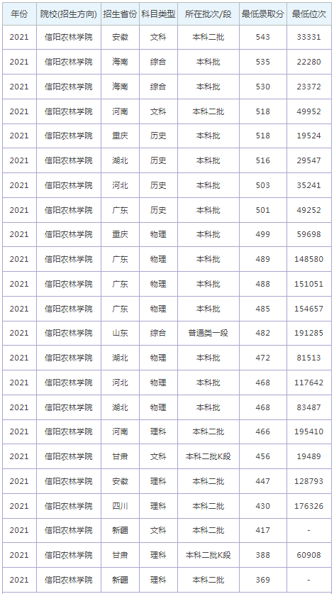 想要報考信陽農(nóng)林學(xué)院的同學(xué),都比較關(guān)注信陽農(nóng)林學(xué)院2022年的錄取分?jǐn)?shù)線,那么,高考多少分可以上信陽農(nóng)林學(xué)院呢?信陽農(nóng)林學(xué)院歷年最低錄取分?jǐn)?shù) 線是多少?下面為大家整理了信陽農(nóng)林學(xué)院錄取分?jǐn)?shù)線2022是多少分(含2021-2022歷年),希望對大家有所幫助,僅供參考。![]() 信陽農(nóng)林學(xué)院錄取分?jǐn)?shù)線2022是多少分? 截止到目前,信陽農(nóng)林學(xué)院2022年錄取分?jǐn)?shù)線還未公布,如果需要2022年信陽農(nóng)林學(xué)院分?jǐn)?shù)線的同學(xué),不妨參考 2021年信陽農(nóng)林學(xué)院錄取分?jǐn)?shù)線和信陽農(nóng)林學(xué)院歷年錄取分?jǐn)?shù)線,希望對大家有所幫助,如有不同,請以信陽農(nóng)林學(xué)院官網(wǎng)最新公布的信息為準(zhǔn)。 2021信陽農(nóng)林學(xué)院錄取分?jǐn)?shù)線 ![]() ![]() 信陽農(nóng)林學(xué)院是公辦還是民辦大學(xué)? 根據(jù)全國高等學(xué)校信息可知,信陽農(nóng)林學(xué)院是公辦大學(xué)。通常來說,公辦大學(xué)社會認(rèn)可度高,各專業(yè)學(xué)費較便宜,民辦大學(xué)各專業(yè)收費較貴。 ![]() 信陽農(nóng)林學(xué)院簡介 信陽農(nóng)林學(xué)院是一所公辦全日制普通本科學(xué)校,坐落于歷史文化名城信陽。 學(xué)校肇始于1910年創(chuàng)建的汝寧府中等實業(yè)學(xué)堂,1951年更名為汝南農(nóng)林中等技術(shù)學(xué)校,1958年更名為信陽農(nóng)業(yè)專科學(xué)校,1984年更名為豫南農(nóng)業(yè)專科學(xué)校,1992年更名為信陽農(nóng)業(yè)高等專科學(xué)校,2008年信陽林業(yè)學(xué)校并入,2013年建立信陽農(nóng)林學(xué)院,升格為普通本科高校。 通過對信陽農(nóng)林學(xué)院錄取分?jǐn)?shù)線的了解,大家大概知道了高考多少分可以上信陽農(nóng)林學(xué)院,以上數(shù)據(jù)源于網(wǎng)絡(luò),僅供參考,大家如果想要了解其他大學(xué)錄取 分?jǐn)?shù)線、大學(xué)簡介、大學(xué)排行榜、專業(yè)選擇等內(nèi)容,請點擊訪問:大學(xué)欄目。 推薦閱讀: 北京大學(xué)錄取分?jǐn)?shù)線 清華大學(xué)錄取分?jǐn)?shù)線 中國科學(xué)技術(shù)大學(xué)錄取分?jǐn)?shù)線 復(fù)旦大學(xué)錄取分?jǐn)?shù)線 南開大學(xué)錄取分?jǐn)?shù)線 同濟(jì)大學(xué)錄取分?jǐn)?shù)線 |