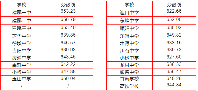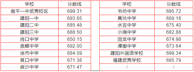 城區未完成的武夷山一中定向招生計劃,剩余的定向生指標面向城區調劑錄取分數線:670.40. 農村未完成的武夷山一中定向招生計劃,剩余的定向生指標面向農村調劑錄取分數線:619.70. 全市未完成的武夷山一中定向招生計劃,剩余的定向生指標面向全市調劑錄取分數線:662.53 三、武夷山二中統招錄取分數線:573.10 四、武夷山崇安外語高級中學統招錄取分數線:426.59 建甌市普通高中最低錄取控制分數線一、建甌一中統招錄取分數線:698.93 二、建甌一中定向招生各校錄取分數線