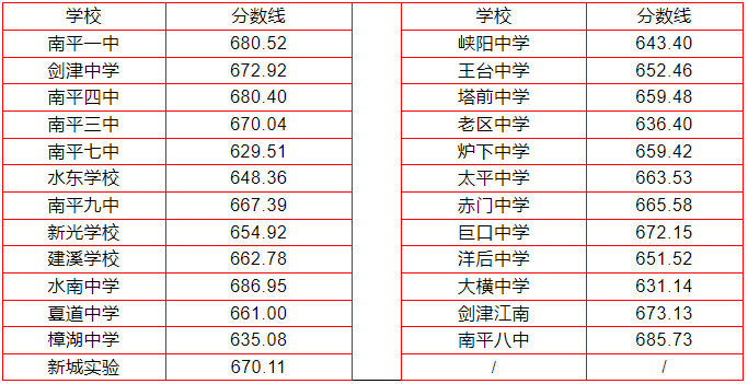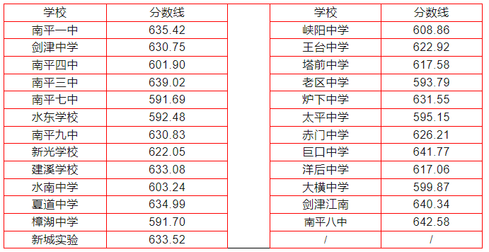 南平一中未完成定向招生計劃,剩余指標的定向生錄取分數線:679.54 四、南平高級中學統招錄取分數線:661.35 五、南平高級中學定向招生各校錄取分數線